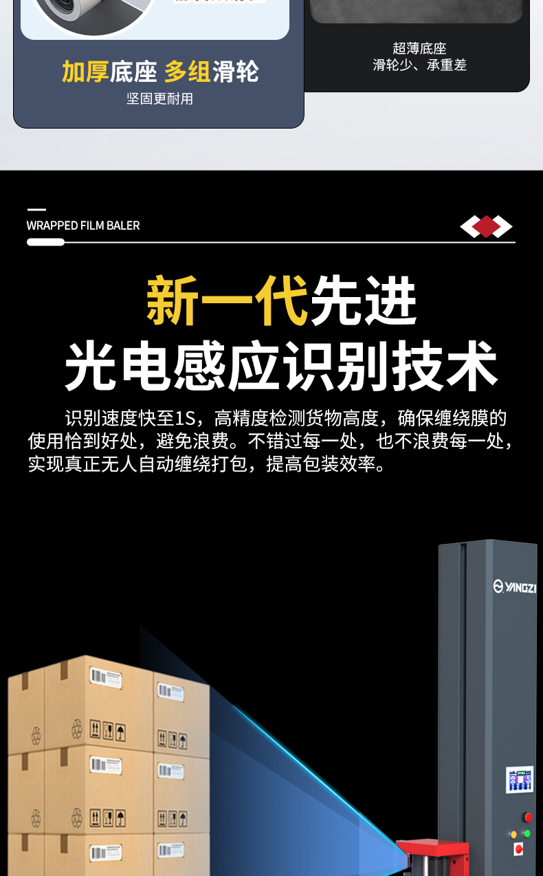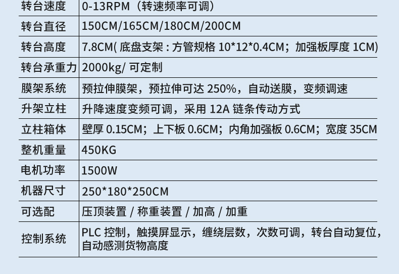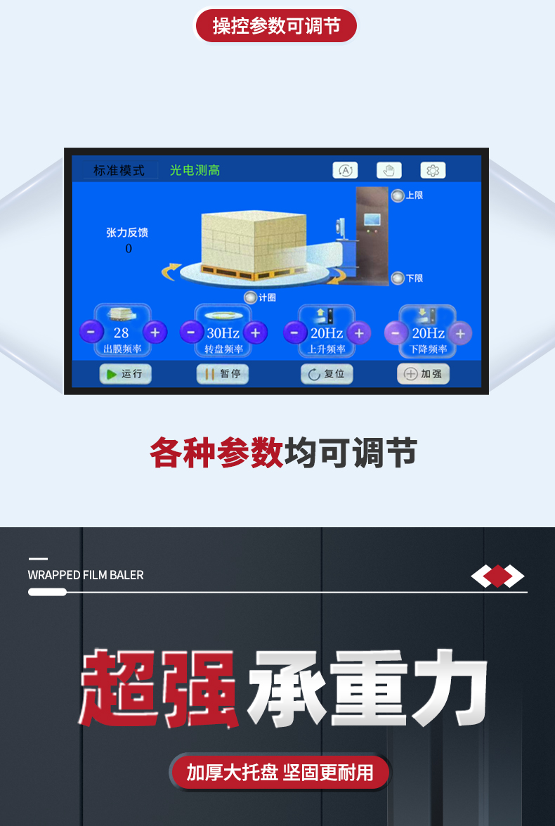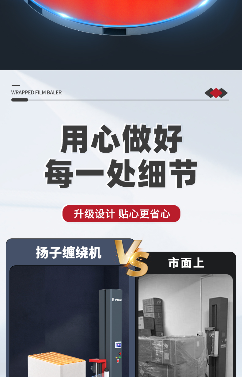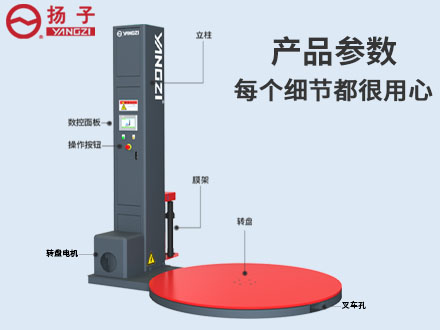 • 扬子圆盘缠绕膜打包机,专为各类托盘货物的固定与包装设计。它采用预拉伸膜架,薄膜拉伸率最高可达250%-450%,能有效节省耗材。设备转盘承重通常可达2000kg或3000kg,包装高度可根据需求定制,最高能处理3000mm的货物。其转盘速度可实现0-12转/分无级变频调节,并具备缓起缓停功能,运行平稳。整机由PLC可编程控制器精准操控,操作简单,能有效提升包装效率,保护货物在搬运和运输过程中防尘、防潮,降低损耗。