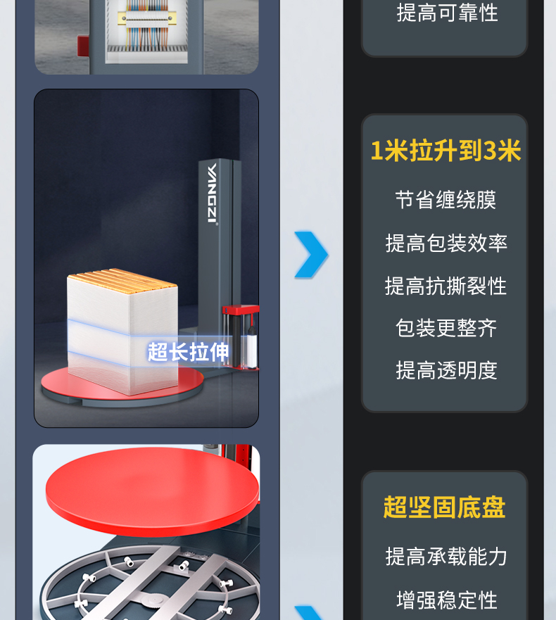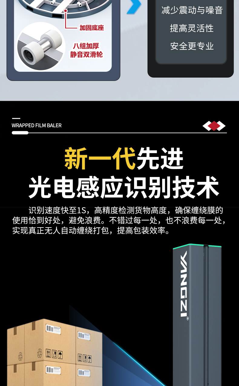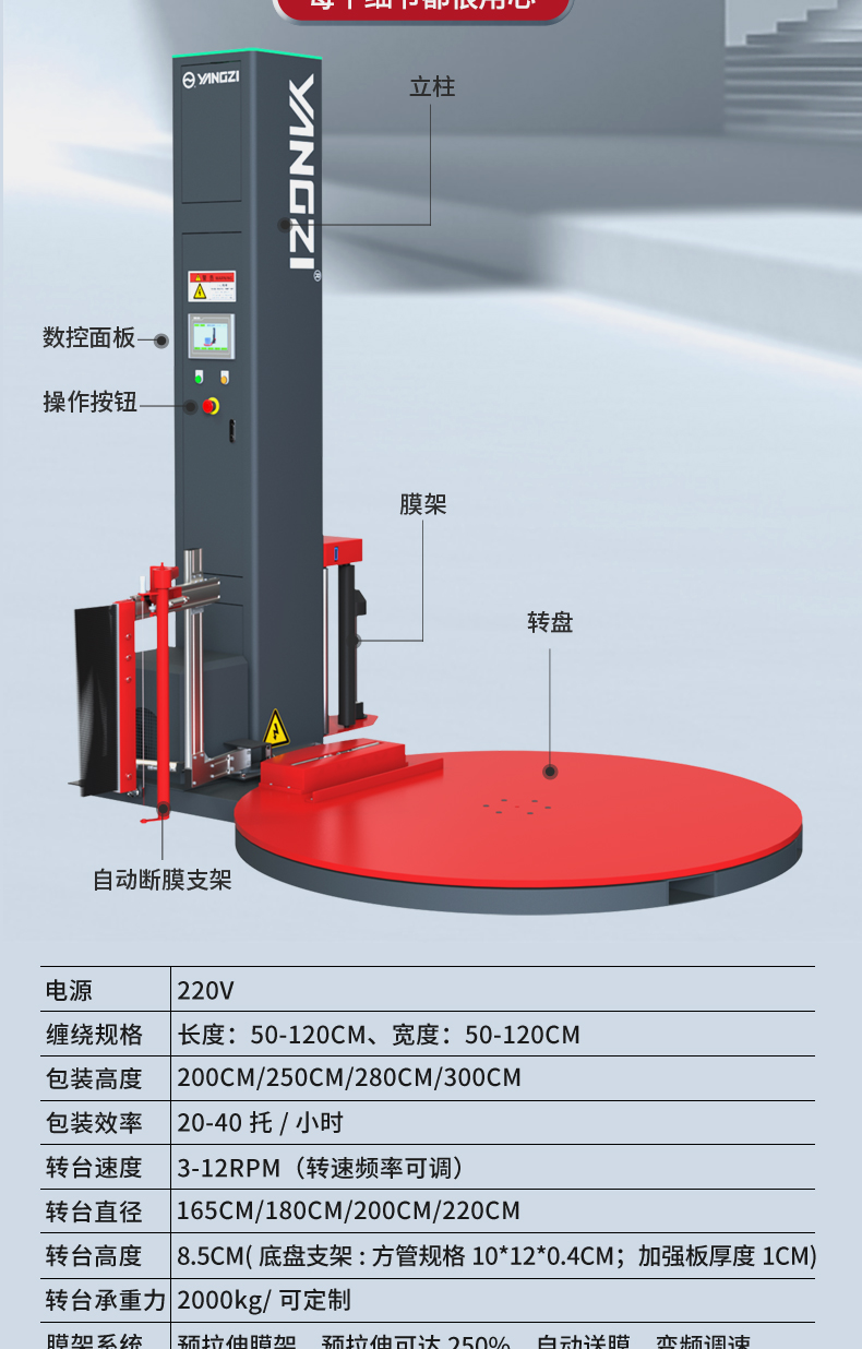 • 扬子自动上断膜缠绕膜机是一款高效的全自动包装设备,专为现代化物流及生产线设计。它通过先进的PLC控制系统与自动上断膜机构,实现了从货物进料、缠绕包装到自动切膜的全流程自动化作业。该设备采用预拉伸膜架,能有效拉伸缠绕膜,显著节约包装耗材。其转盘变频调速系统允许根据需求灵活调整缠绕方式与层数。此机型广泛应用于化工、电子、食品、饮料、造纸等多个行业,能有效保护货物,起到防尘、防潮、防散垛的作用,是提升包装效率、降低人工成本的理想选择。