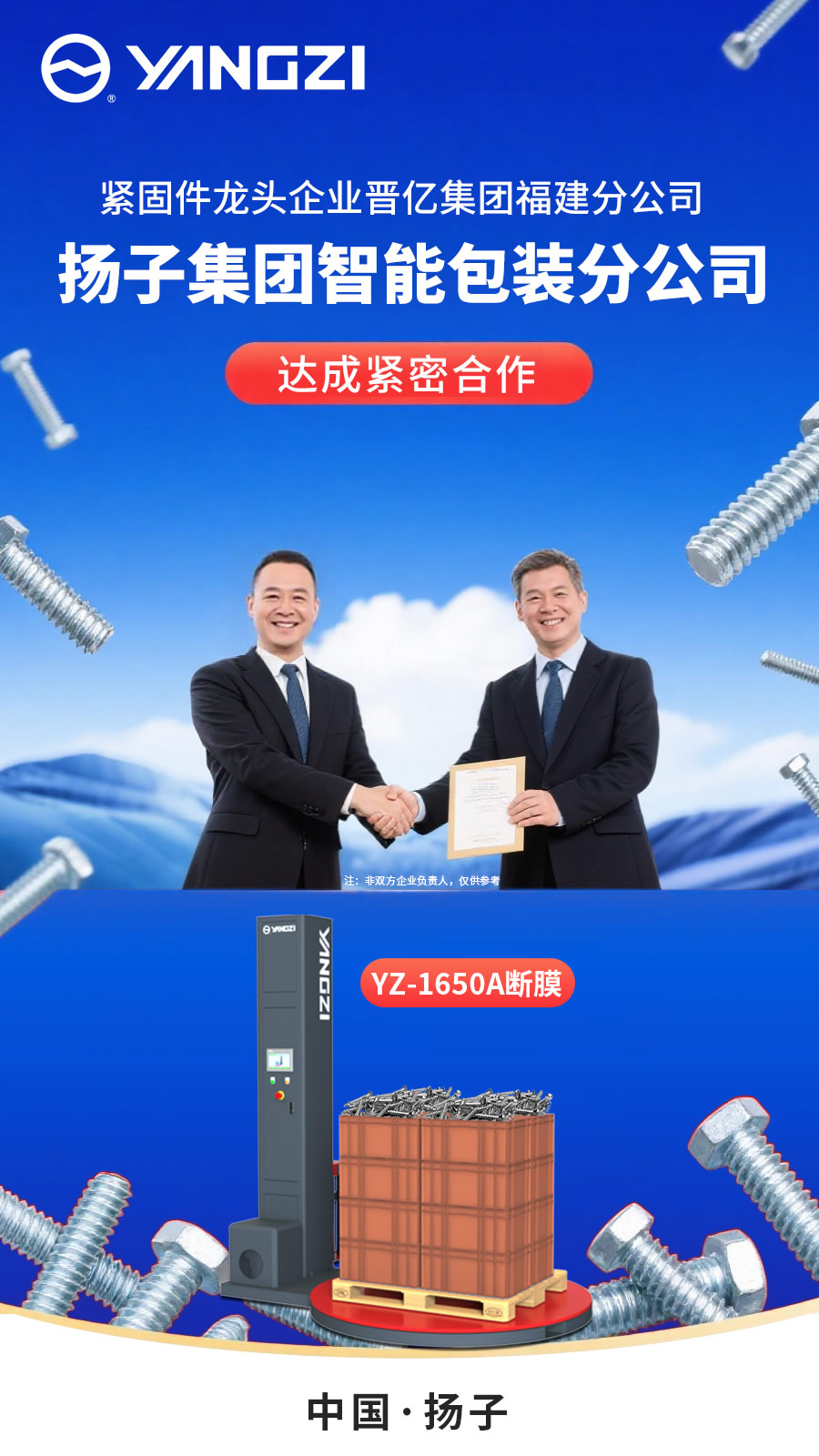 近日,扬子缠绕膜包装机(YZ-1650A断膜)与晋亿集团福建分公司(晋亿实业股份有限公司福州分公司)达成战略合作。此次合作旨在通过先进包装技术提升物流效率与产品保护,共同推动紧固件行业的后道包装。