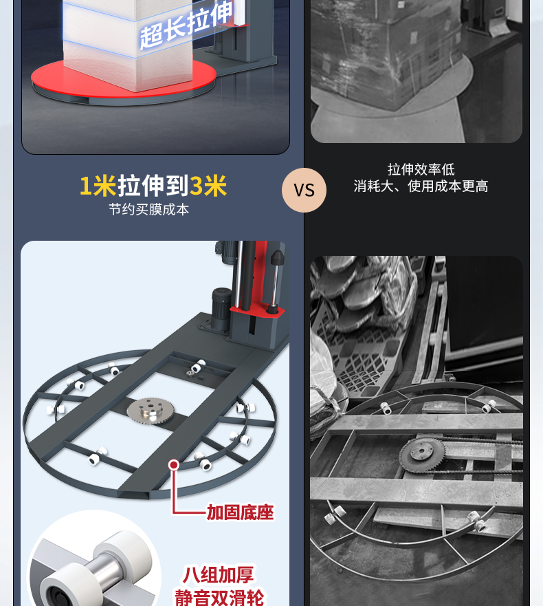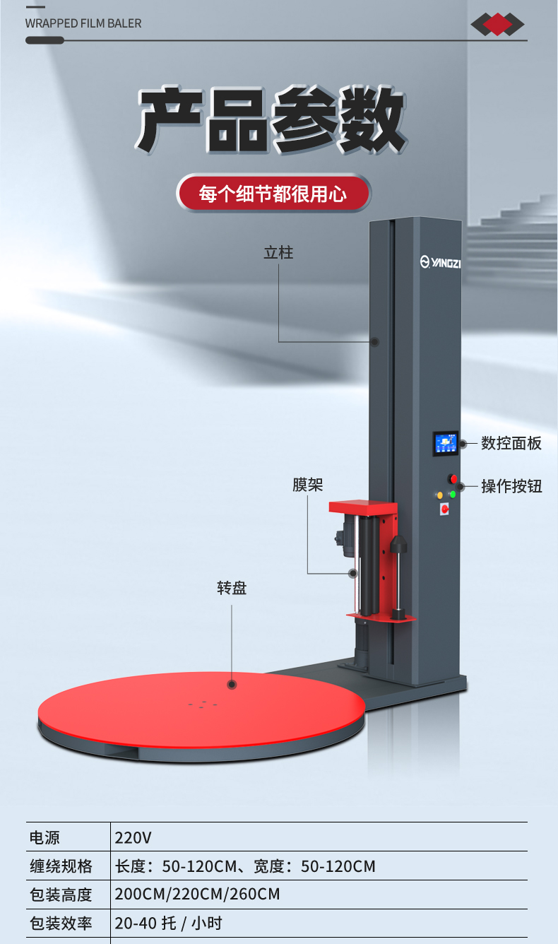 • 扬子圆盘缠绕膜打包机,专为各类托盘货物的固定与包装设计。它采用预拉伸膜架,薄膜拉伸率最高可达250%-450%,能有效节省耗材。设备转盘承重通常可达2000kg或3000kg,包装高度可根据需求定制,最高能处理3000mm的货物。其转盘速度可实现0-12转/分无级变频调节,并具备缓起缓停功能,运行平稳。整机由PLC可编程控制器精准操控,操作简单,能有效提升包装效率,保护货物在搬运和运输过程中防尘、防潮,降低损耗。